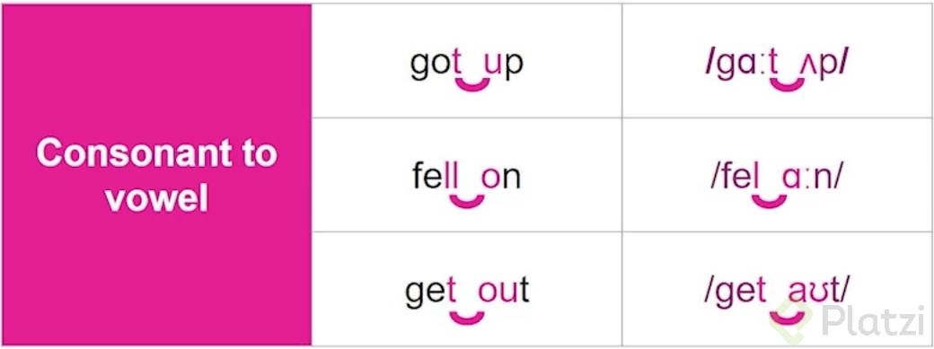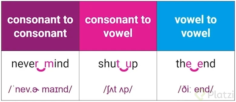 - Consonante a vocal: Ejemplos como "shut up" (cállate) hacen que parezca que la consonante final de una palabra inicia la siguiente.