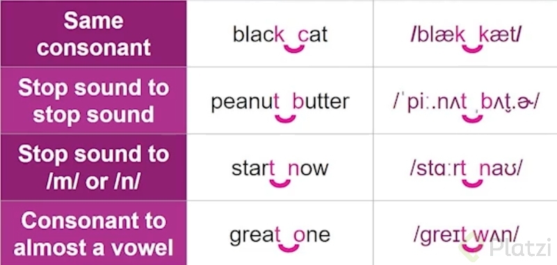 - La misma consonante: Como en "black cat" (gato negro), donde el sonido /k/ de "black" se conecta automáticamente con "cat".