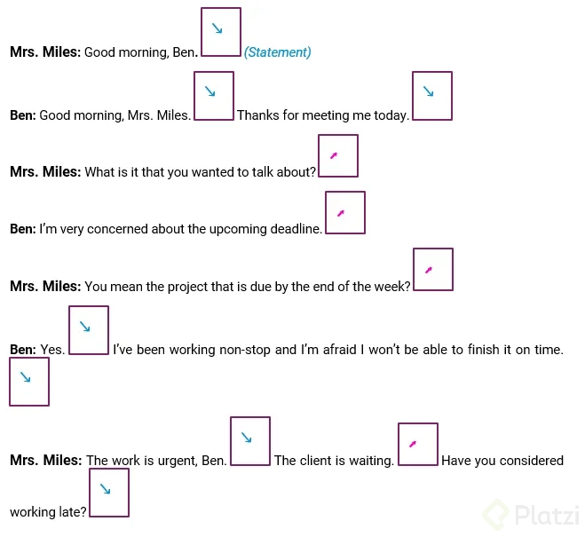 - Preguntas sí-no: Usualmente con tonos ascendentes para sugerir que se espera una respuesta, sin embargo, un tono descendente puede expresar insistencia.
