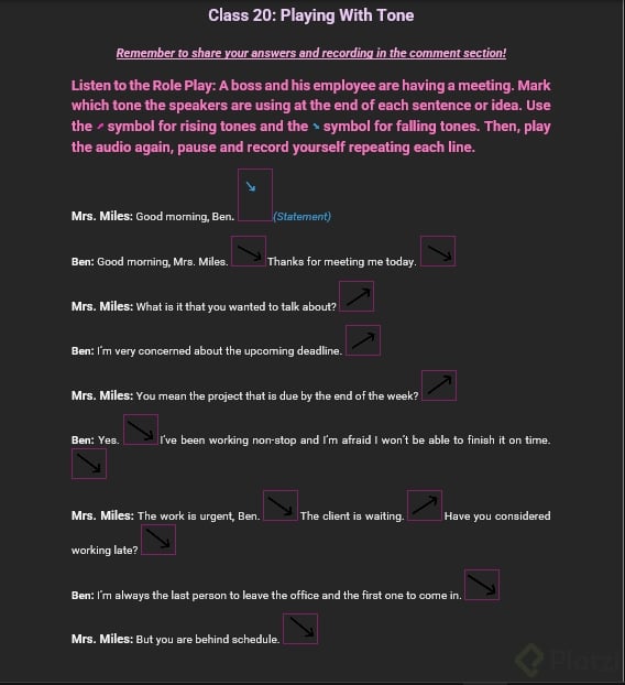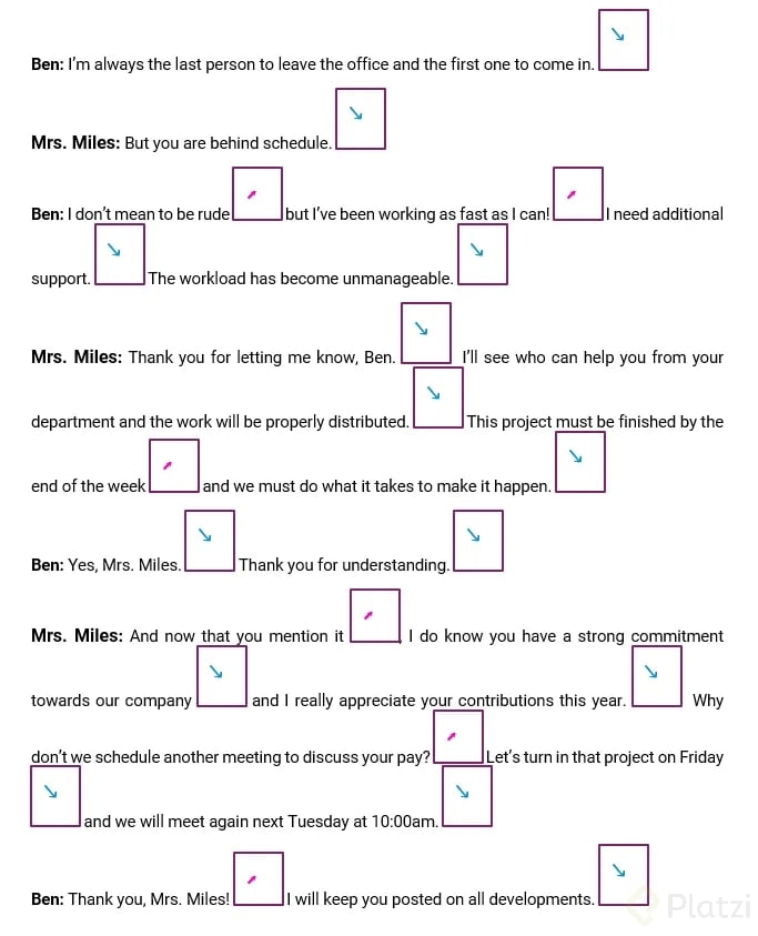 - Role-playing: Simula conversaciones como la de Ben y la señora Miles. Esto te permitirá experimentar con entonaciones en un contexto realista.