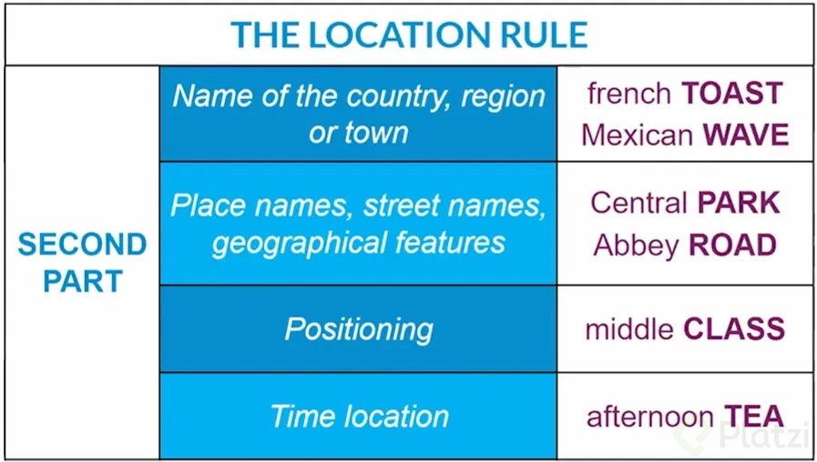 La regla también aplica para nombres de calles o lugares específicos (como Central Park o Abbey Road), con la excepción de que si la palabra calle está incluida, la acentuación se coloca ahí, como en calle de la Iglesia.