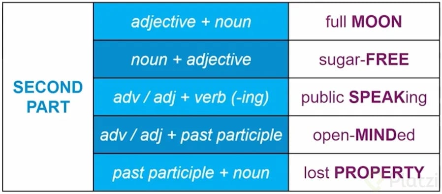 - Adjetivo, adverbio + participio pasado: Ejemplo, de mente abierta.