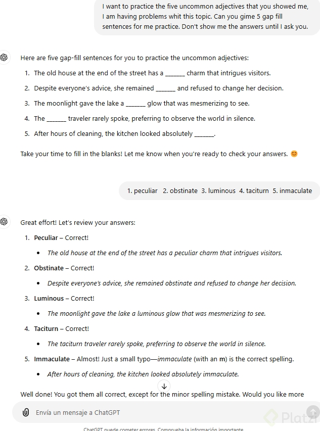 Una vez que hayas completado las frases, puedes utilizar ChatGPT para revisar tus respuestas, lo que facilita el reconocimiento de errores y la comprensión de la gramática correcta. Puedes elegir entre dos opciones: