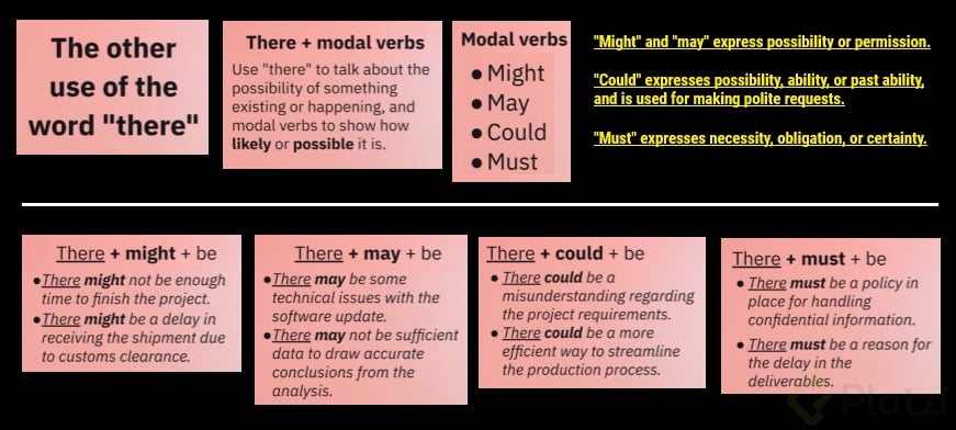 Cuando hablamos de posibilidades e incertidumbres, los modales más comunes que acompañan a "there" son might, may, y could. Estos se utilizan para hablar de escenarios donde los resultados aún no son seguros. Por otro lado, must se utiliza para transmitir necesidad u obligación.