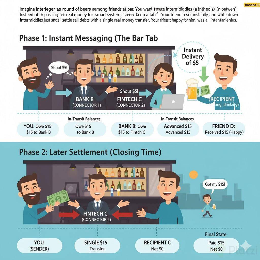- Compensación (framing) y liquidación (settlement) van por separado: los mensajes viajan a velocidad de internet; los fondos reales se liquidan luego en lotes fuera del protocolo.