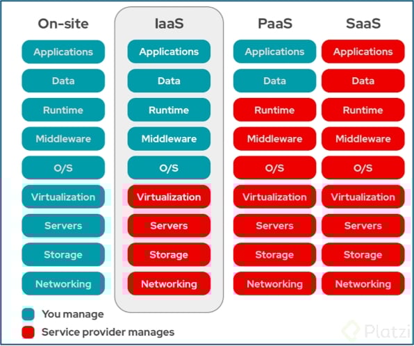 La infraestructura como servicio, conocida como IaaS, es un modelo que ofrece recursos informáticos como servidores virtuales y almacenamiento a través de la nube. Cuando se habla de IaaS, es común pensar en servicios donde se debe gestionar el sistema operativo. Algunos ejemplos son las instancias EC2 en Amazon, Google Compute Engine y Azure VMs. Es la opción ideal para migrar inicialmente servicios de entornos on-premises a la nube.