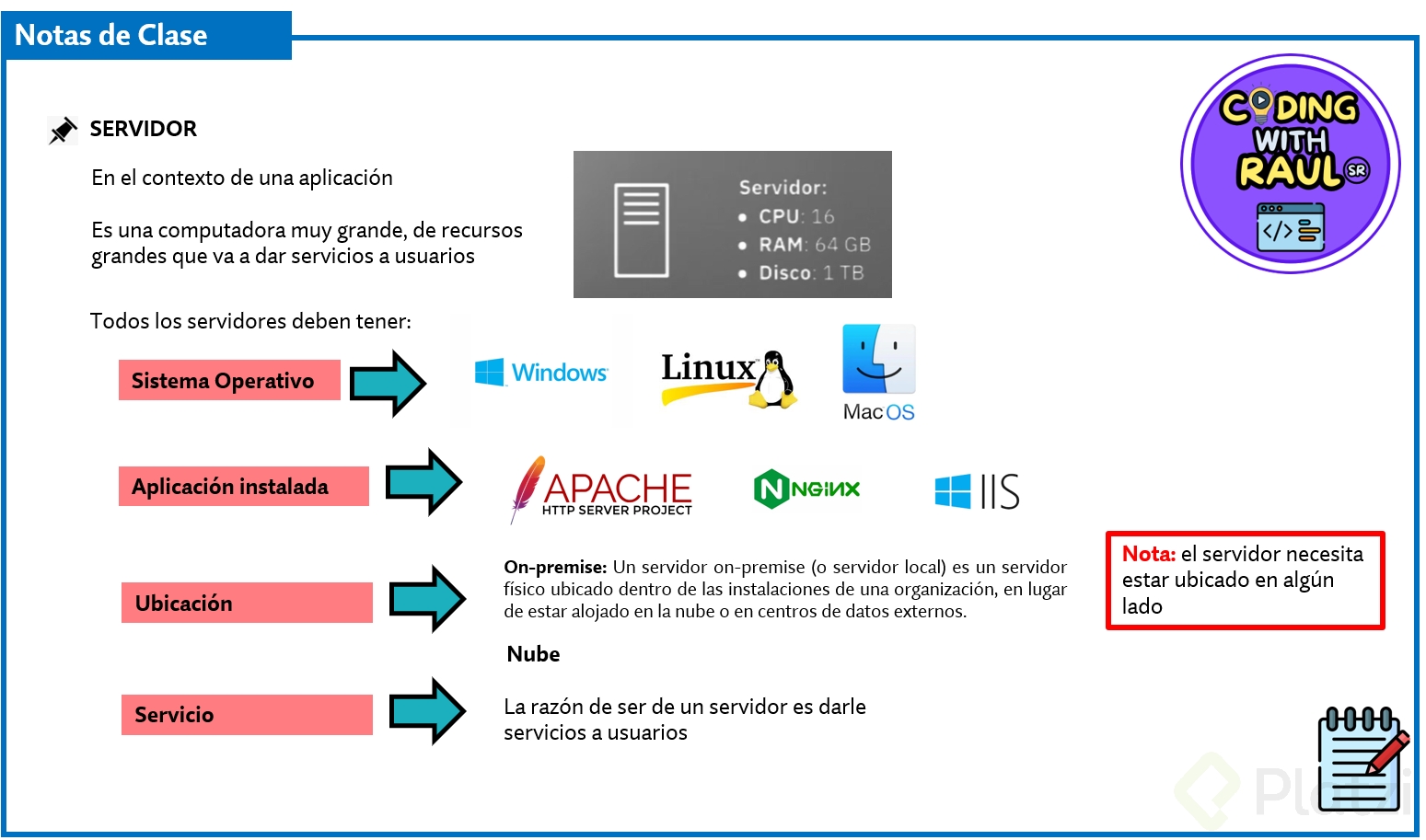 - Funcionalidad de servicio: La razón de ser de un servidor es ofrecer servicios, ya sea corriendo aplicaciones como Platzi Wallet para que los usuarios puedan interactuar y utilizarlo.