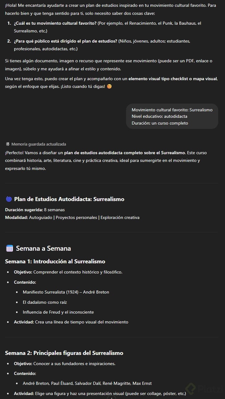 - Componentes: Claro desglose semanal con teoría y actividades prácticas organizadas por fecha y hora.