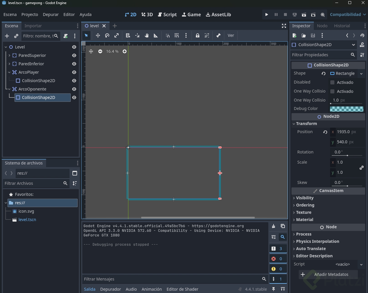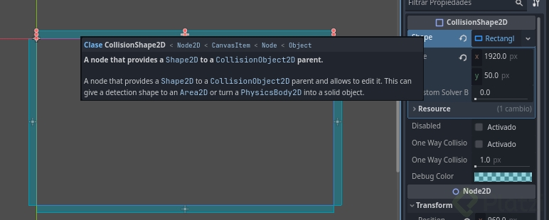 CollisionShape2Dy elige una forma rectangular (RectangleShape). - Configura su tamaño y posición para ocupar la parte superior del escenario.