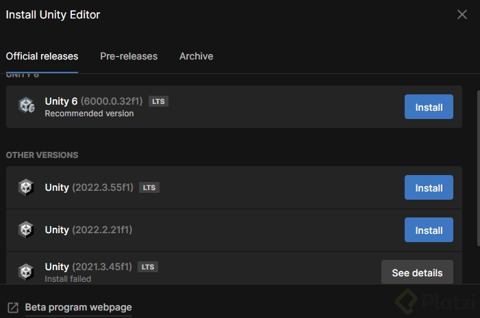 - Te recomiendo instalar una versión con etiqueta LTS (Long Term Support), como la 2021.3.10. Estas versiones son estables y confiables para el desarrollo.