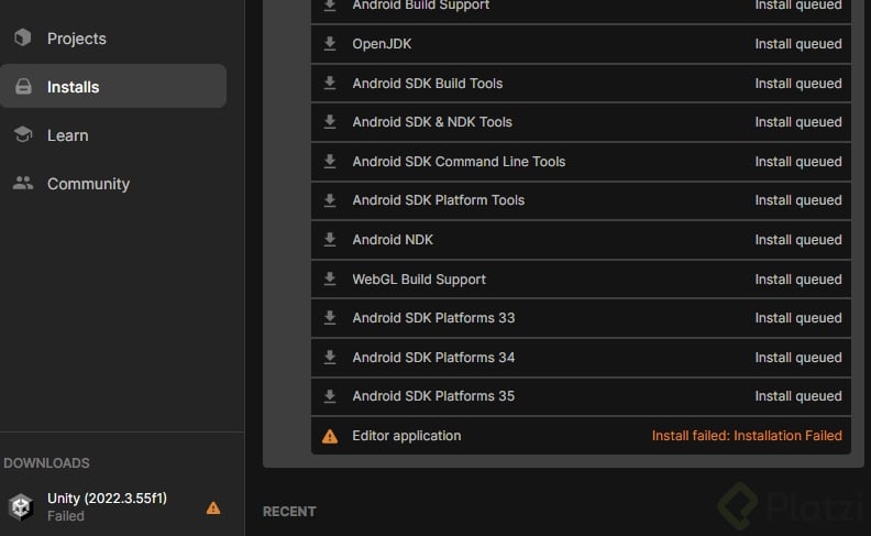 - En Unity Hub, dirígete a la pestaña de instalaciones y haz clic en "Install editor".