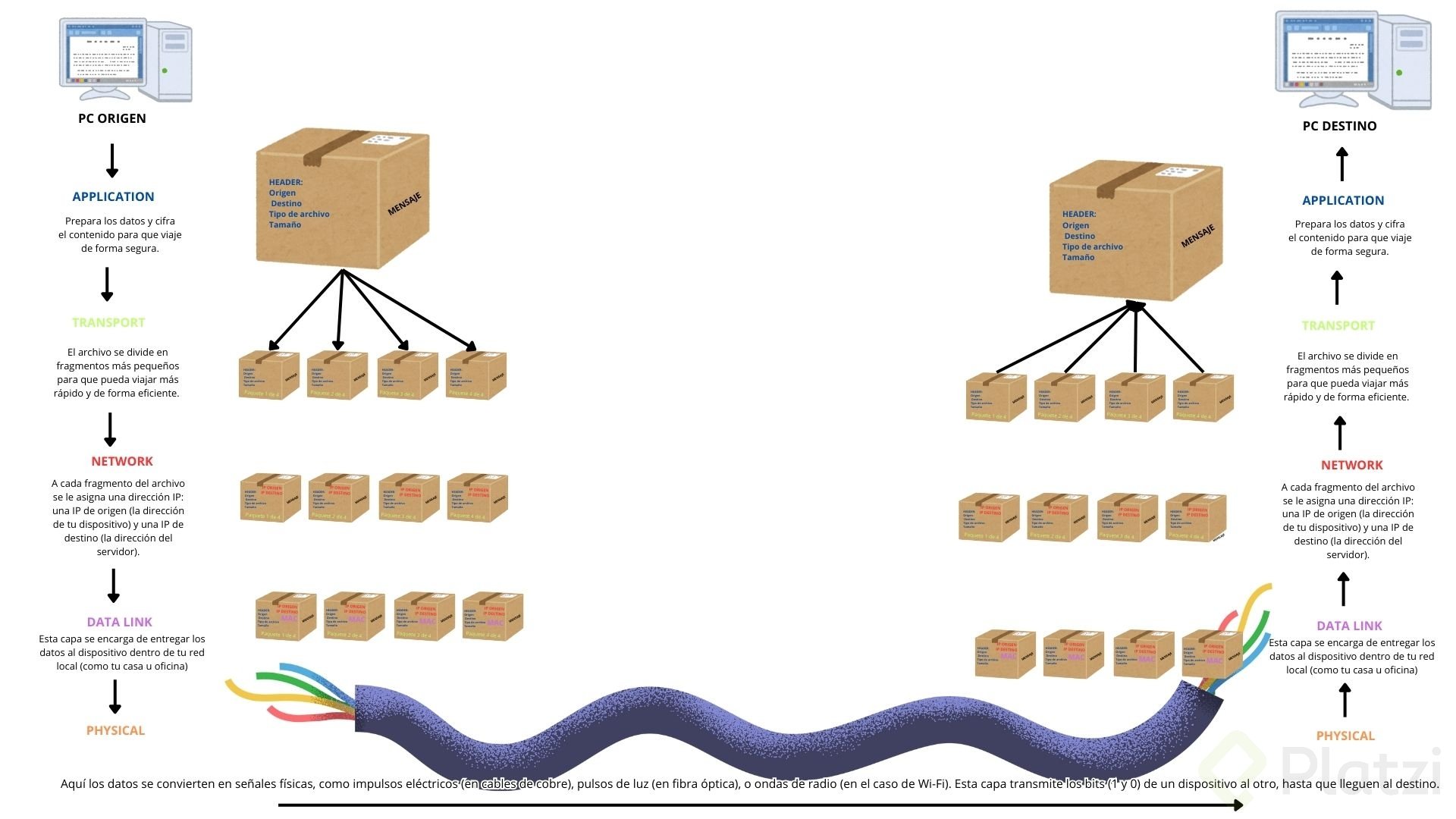 Una vez en la capa de transporte, si el paquete original es demasiado grande, se divide en paquetes más pequeños, cada uno conservando el encabezado de la capa anterior. En esta etapa, se agrega un nuevo encabezado que también contiene datos sobre el origen y destino, adaptados al contexto de la capa de transporte.