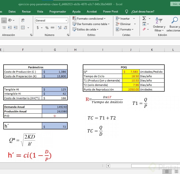 - Utiliza la función de raíz cuadrada en Excel para calcular ( Q = \sqrt{\frac{2DS}{H'}} ), donde ( D ) es la demanda anual, ( S ) el costo de preparación, y ( H' ) el costo de almacenamiento ajustado.