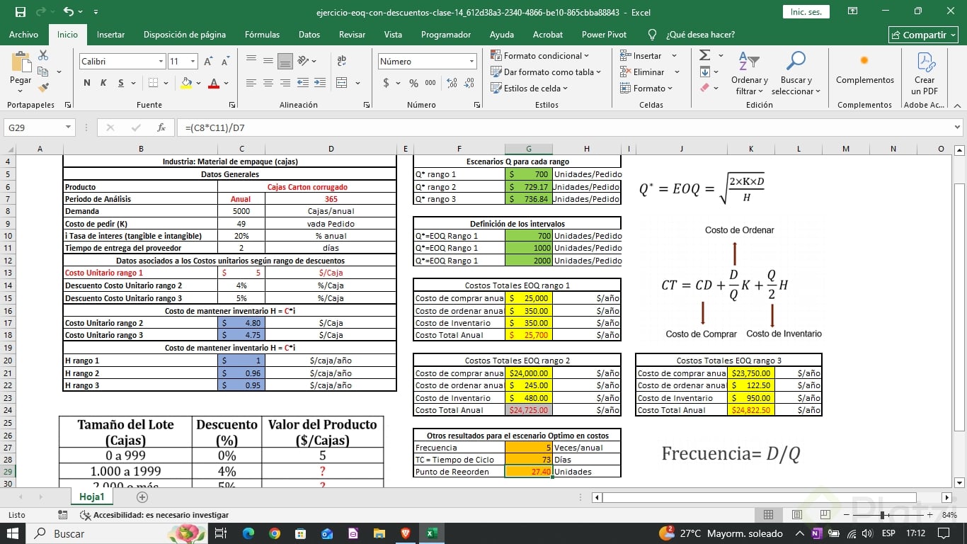- Usamos la fórmula EOQ: (\sqrt{\frac{2 \times \text{Costo de Ordenar} \times \text{Demanda Anual}}{H}}).