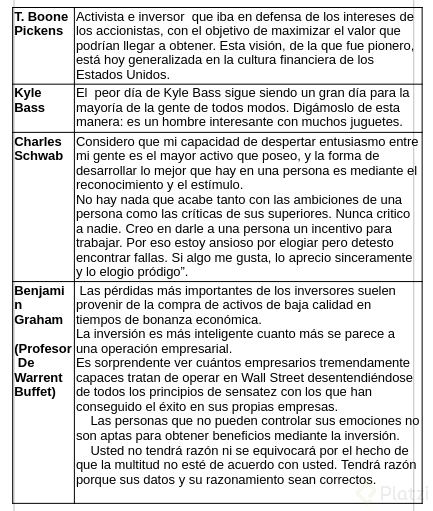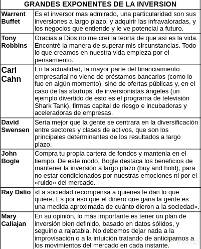 Warren Buffett: Conocido como el "oráculo de Omaha", Buffett es el inversionista más destacado a nivel mundial. Sus consejos incluyen no invertir en negocios que no entiendes, ser temeroso cuando otros son codiciosos, y aprovechar los ciclos bajistas del mercado como una oportunidad de compra.