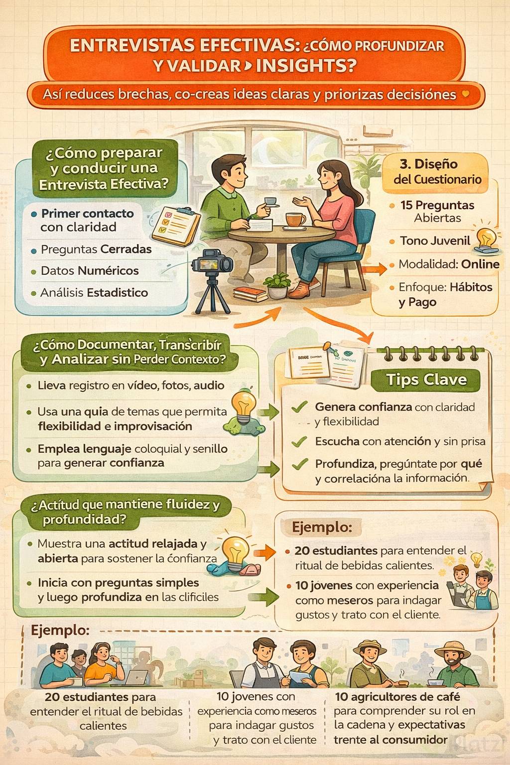 Las entrevistas son el paso clave para ir a la profundidad, confirmar insights y captar matices que las encuestas no muestran. Con una guía de temas flexible, lenguaje sencillo y un clima de confianza, es posible co-crear ideas, leer el día a día de las personas y tomar mejores decisiones estratégicas y de innovación.