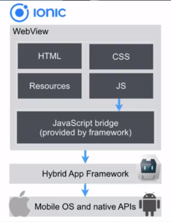 Ionic corre en un WebView el cual simula un navegador web, por ello es que puedes escribir código directamente en HTML y CSS para las interfaces y TypeScript para la lógica.