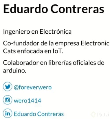 Eduardo Contreras Arroba es un ingeniero especializado en electrónica, quien cofundó una empresa innovadora en Aguascalientes, México, dedicada al diseño y desarrollo de hardware y sistemas embebidos. En su compañía, trabajan intensamente en la aplicación de estas tecnologías para diversas soluciones. Asimismo, Eduardo es un colaborador activo en las librerías oficiales de Arduino, destacándose en tecnologías como Lora y Callen elPP, lo que lo posiciona como una autoridad en el tema. Su relación con Arduino y AdaFre le ha permitido participar en importantes conferencias tecnológicas a nivel mundial, como las de Nueva York y San Francisco.