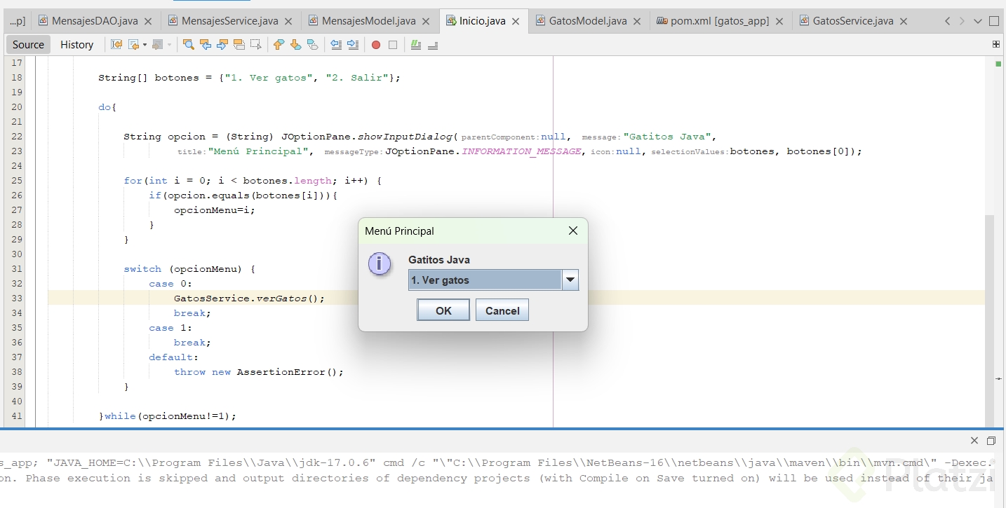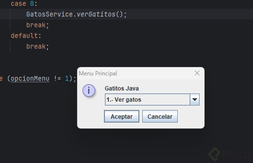 Esta clase manejará la interfaz gráfica y el menú mediante la clase JOptionPane de Java. Aquí se fragmentará el ciclo de control del menú: