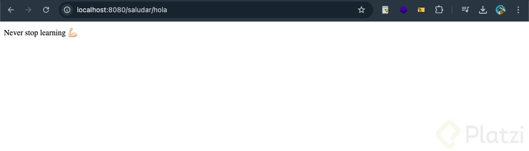 Una vez levantado el servidor, abre tu navegador e ingresa localhost:8080/saludar/hola. Deberías ver como respuesta "Nunca pares de aprender". Esto demuestra que todo está correctamente configurado y en funcionamiento.