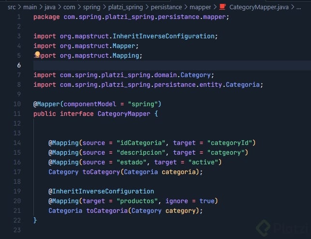 Aquí, @Mapping configura cómo se mapean fielmente los datos desde idCategoria, descripcion, y estado hacia sus respectivos atributos en la entidad Category.