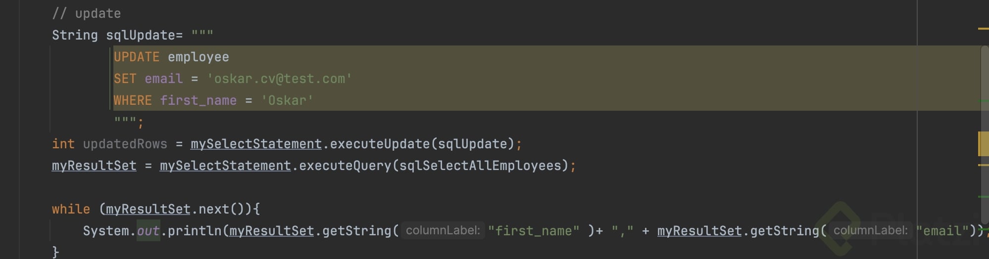 int rowsAffected = myStmt.executeUpdate("UPDATE employees SET email='joanna2@example.com' WHERE firstName='Joanna'");