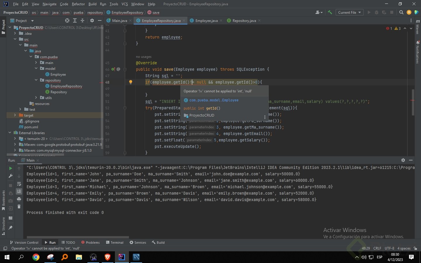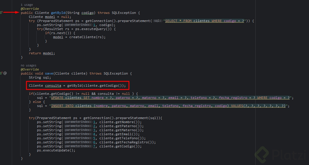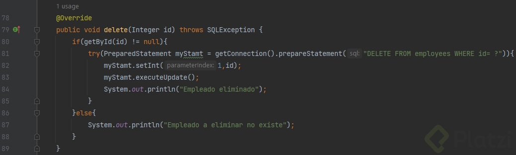 El método delete(Integer id) está implementando la funcionalidad de eliminar un registro de la base de datos. Utiliza una conexión a la base de datos obtenida mediante getConnection(), luego crea un objeto PreparedStatement con la consulta SQL “DELETE FROM employees WHERE id=?” y establece el valor del parámetro id utilizando myStamt.setInt(1, id). Finalmente, ejecuta la actualización mediante myStamt.executeUpdate() para eliminar el registro correspondiente al ID proporcionado.