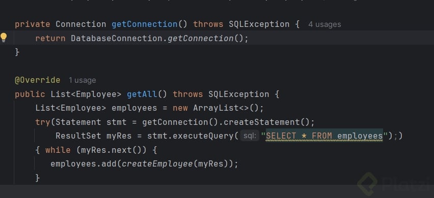 Cada método en la clase EmployeeRepository necesita abrir y cerrar conexiones meticulosamente para evitar fugas. A continuación, te mostramos cómo modificar los métodos para lograrlo: