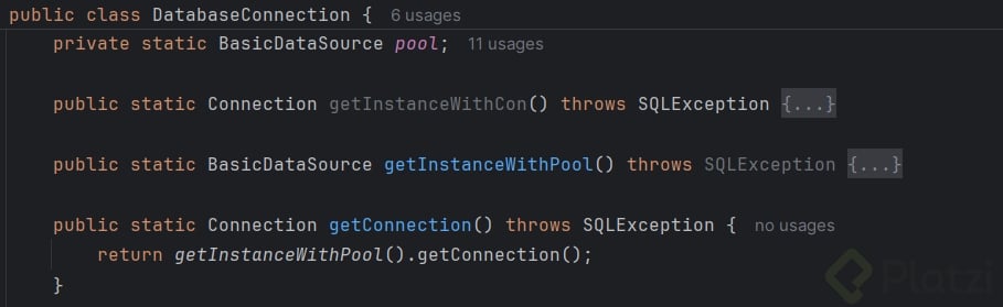 Es esencial poder extraer conexiones del pool de manera eficiente. Un método estático puede facilitar esta tarea: