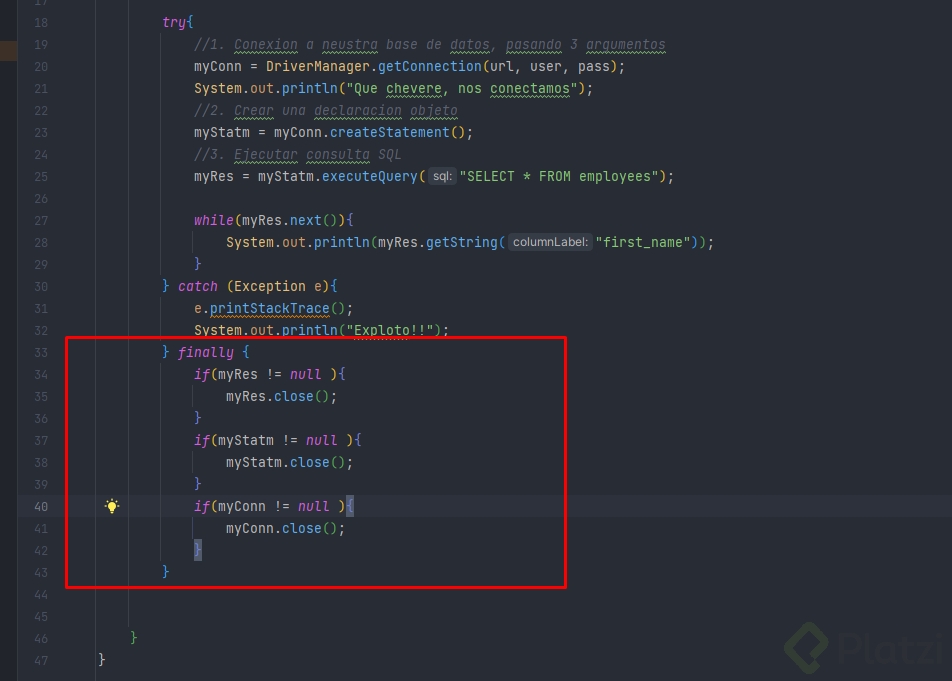 Es una buena práctica cerrar los recursos con el método close() después de usarlos para liberar los recursos utilizados. Esto se aplica a la programación JDBC con Java, así como a cualquier otra situación en la que se utilicen recursos del sistema, como archivos o sockets. Una forma común de hacerlo es usando el bloque finally para asegurarnos de que los recursos se cierren incluso si se produce una excepción en el código.