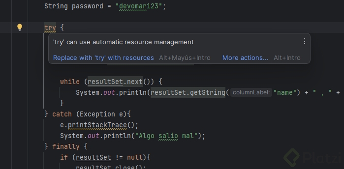 Otra forma introducida en Java 7 es usar la característica “Try with resources” que implementan la interfaz AutoCloseable o su subinterfaz Closeable. Antes de la introducción del “try con recursos”, era necesario cerrar manualmente los recursos abiertos utilizando bloques finally para asegurarse de que se liberaran correctamente, incluso en caso de excepciones. Sin embargo, esto puede ser propenso a errores y aumenta la cantidad de código necesario. Al utilizar esta estructura, los recursos declarados dentro del bloque try se cierran automáticamente al finalizar el bloque, ya sea que se haya producido una excepción o no.