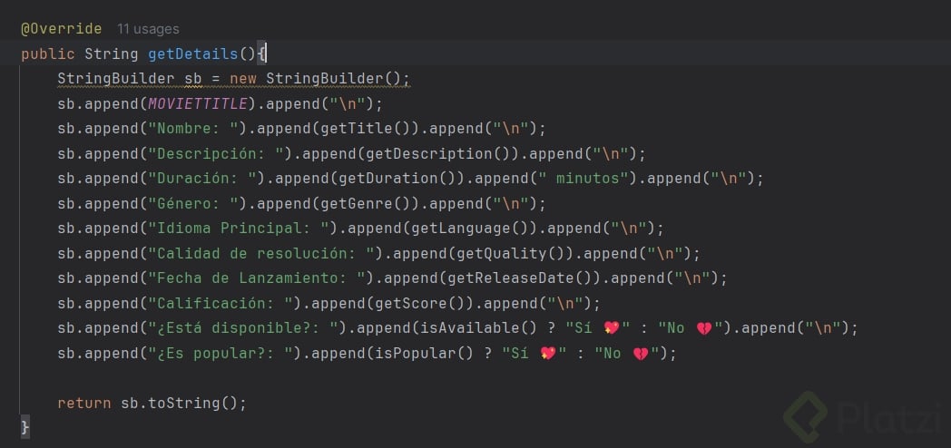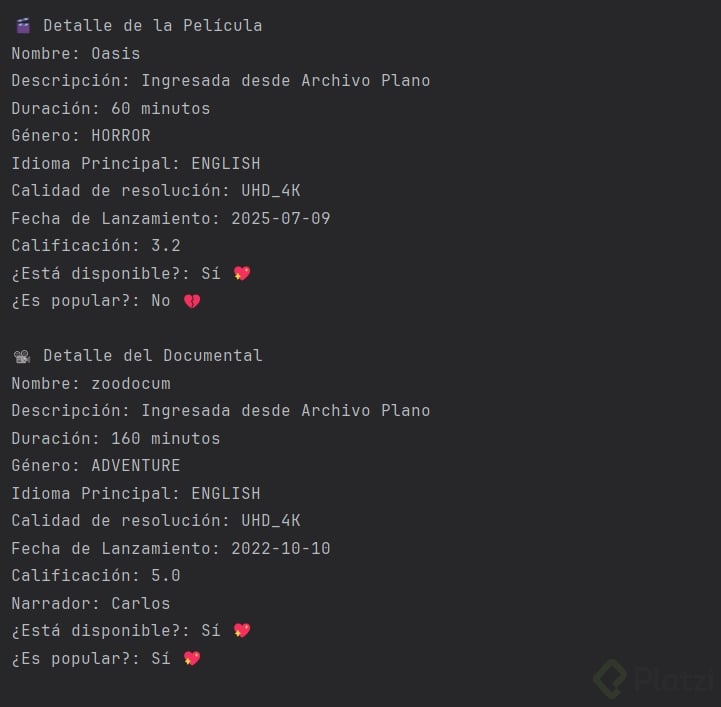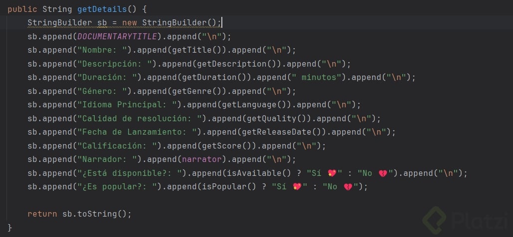 - Intenta sobreescribir el método obtener ficha técnica en cada tipo de contenido. Así, cada clase mostrará información extra y relevante según su naturaleza.
