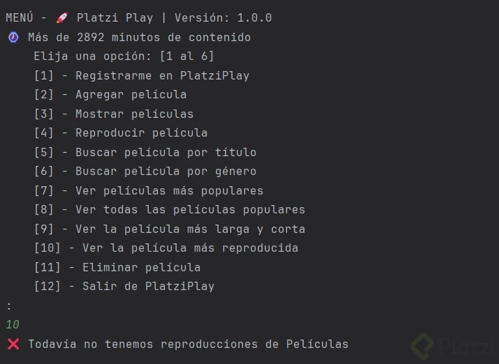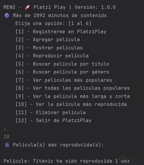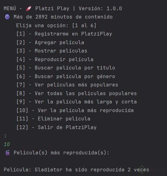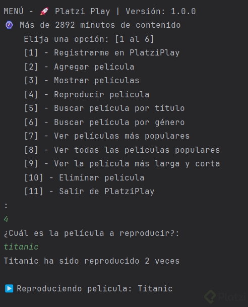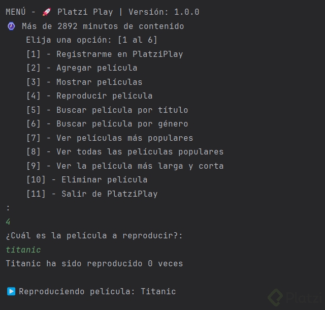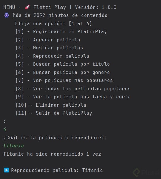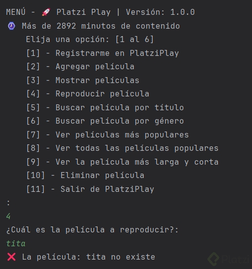 - Se solicita el nombre de la película a reproducir, se busca en la plataforma y, si existe, se llama al método correspondiente.
