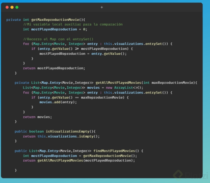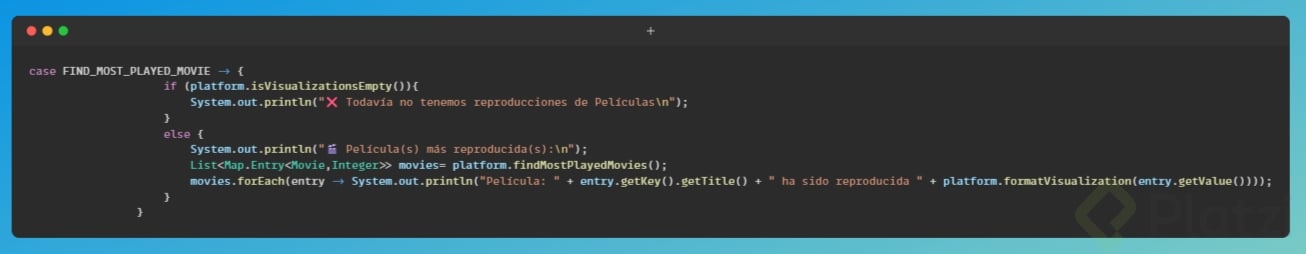 - Se utiliza el método getOrDefault del mapa para obtener la cantidad de visualizaciones; si la película aún no ha sido vista, retorna cero.