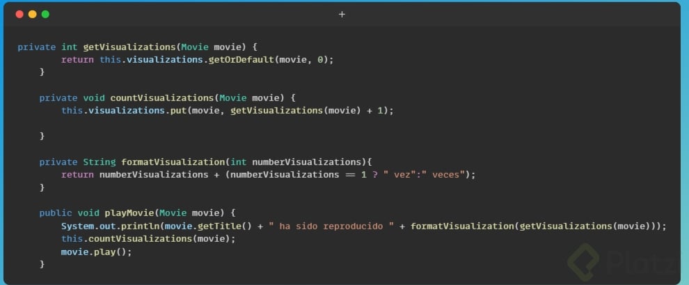 - Esta función puede estar condensada en una sola línea, usando visualizaciones.put y el resultado de getOrDefault, o puede separar el conteo actual en una variable para mayor claridad.