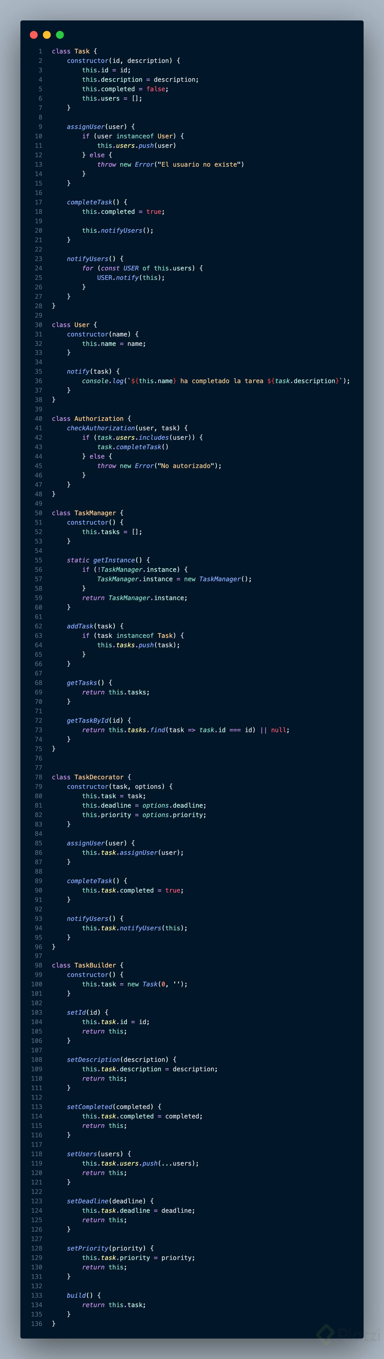 //Con DECORATOR PATTERN: export class TaskDecorator { constructor(task, options) { this.task = task; this.deadline = options.deadline; this.priority = options.priority; } assignUser(user) { this.task.assignUser(user); } completeTask() { this.task.completeTask(); } notifyUsers() { this.task.notifyUsers(this); } }