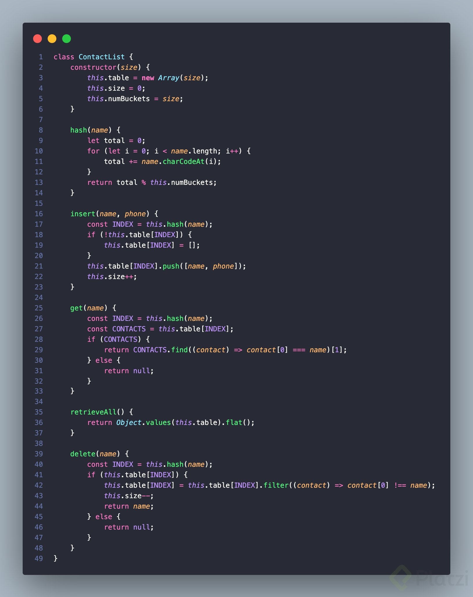 Día 2578Estructuras de datos en JavaScript01:45 min79Playground - Crea tu propia implementación de un array80Hash tables en JavaScript03:13 min81Playground - Implementación de una HashTable para ContactosViendo ahora