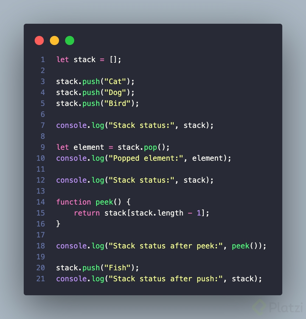 Para implementar un stack en JavaScript, podemos usar un array y sus métodos push y pop para agregar y eliminar elementos. Sin embargo, si queremos implementar un stack de una manera más “nativa”, podemos hacer lo siguiente.