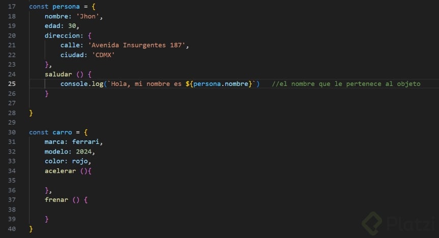 console.log(persona.saludar()); // Imprime "Hola, mi nombre es John"