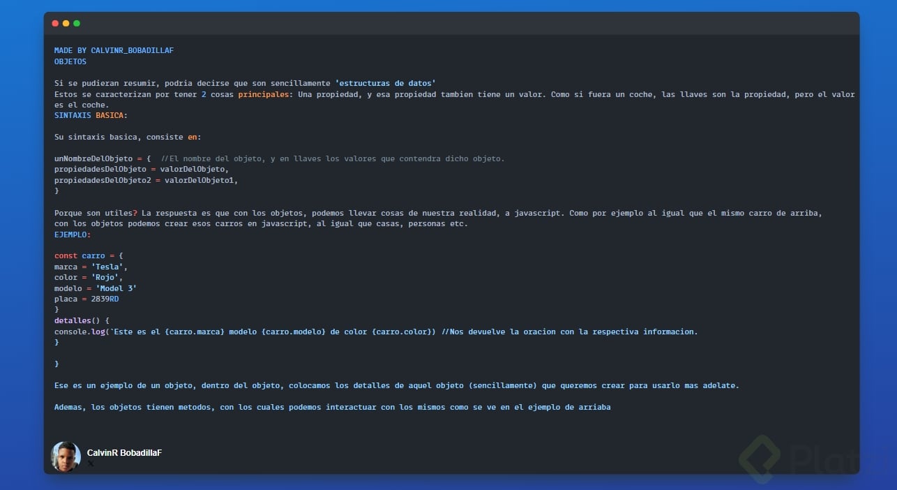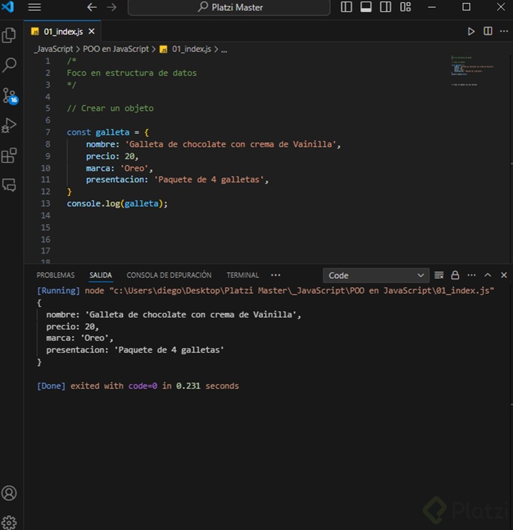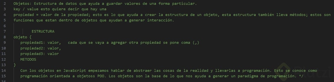 Un objeto se compone de propiedades y valores. Cada propiedad representa un atributo del objeto y está asociada a un valor. La síntaxis típica para representar un objeto es a través de llaves {} y dentro se definen pares de propiedad: valor.