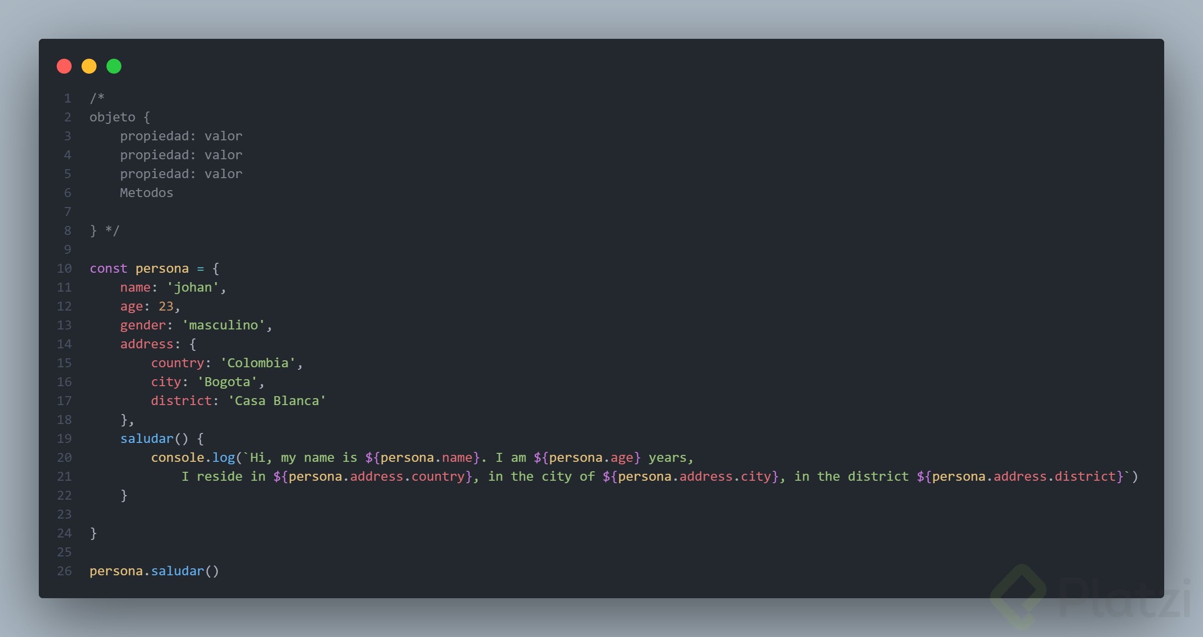 En este caso, saludar es un método del objeto persona que devuelve un saludo utilizando la propiedad nombre del mismo objeto.