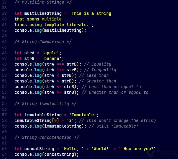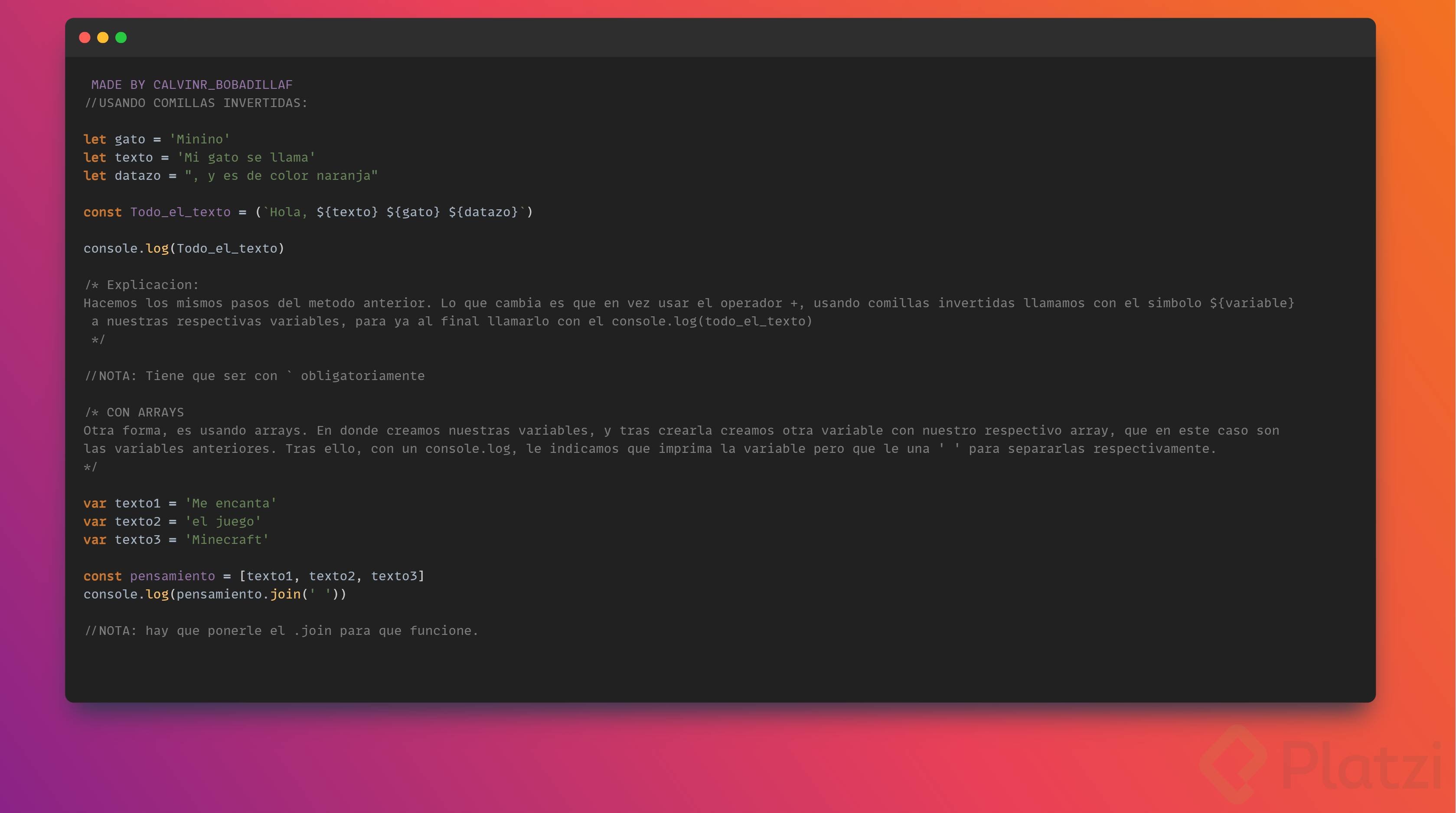 let nombre = 'Mundo'; let saludo = `Hola ${nombre}, JavaScript es genial y feliz 😊`; console.log(saludo); // Imprime "Hola Mundo, JavaScript es genial y feliz 😊"