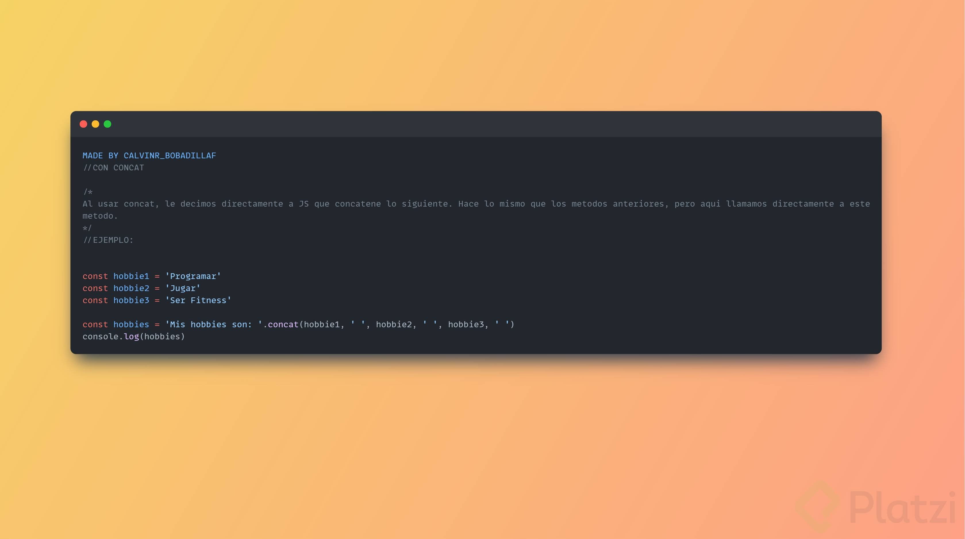 +: Esta es la forma más directa, donde sumamos dos strings.let string1 = 'Hola Mundo'; let string2 = 'JavaScript es genial'; let concatenado = string1 + " " + string2; console.log(concatenado); // Imprime "Hola Mundo JavaScript es genial" -