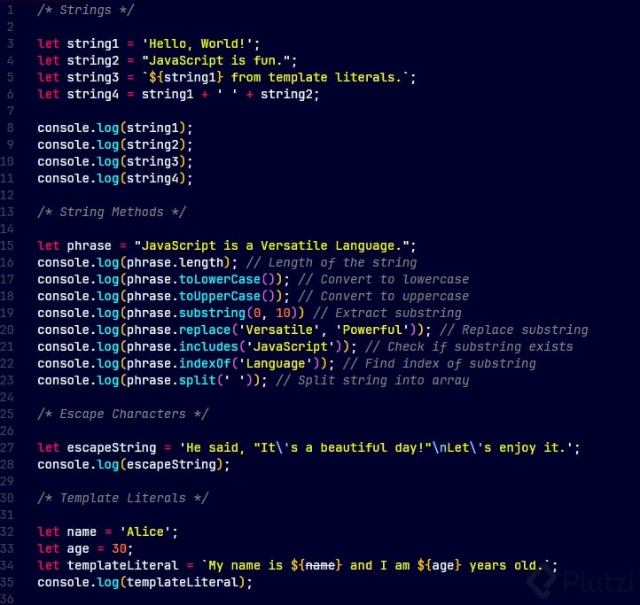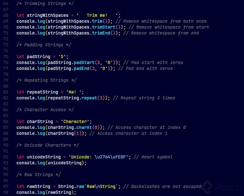 JavaScript ofrece un vasto arsenal de métodos para trabajar con strings, lo que simplifica enormemente la manipulación de texto. Aquí algunos ejemplos fundamentales para cualquier desarrollador: