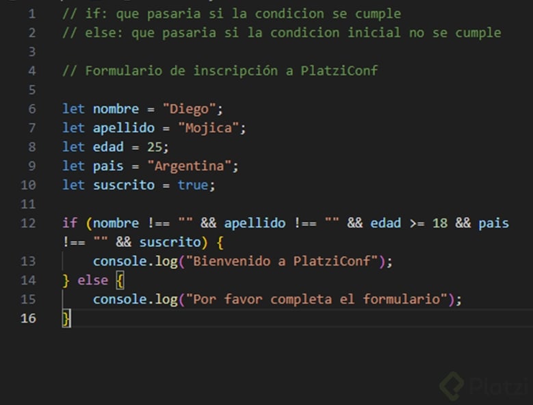 Aquí, primero se verifica si nombre es igual a "Diego". Si no es así, se comprueba la siguiente condición else if para "Nico", y en caso de que ninguna de las condiciones anteriores sea verdadera, se ejecuta el bloque dentro del else.