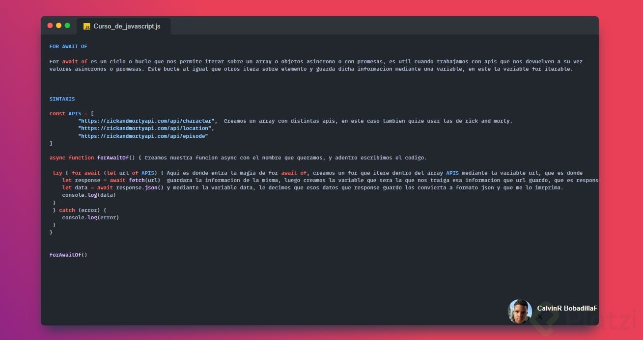 El for await...of es una herramienta poderosa en JavaScript. Es un bucle que permite iterar sobre objetos asíncronos, como promesas, de manera que podemos esperar a que cada una se resuelva antes de continuar con la siguiente. La sintaxis es intuitiva y se adapta bien cuando necesitas trabajar con múltiples solicitudes HTTP.
