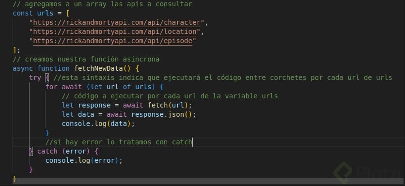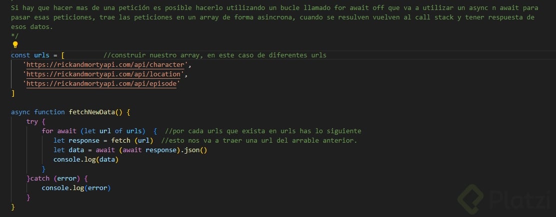 Por ejemplo, digamos que tienes un array de URLs de una API, como la de Rick and Morty. Puedes iterar sobre cada URL y realizar una petición fetch asíncrona de la siguiente manera: