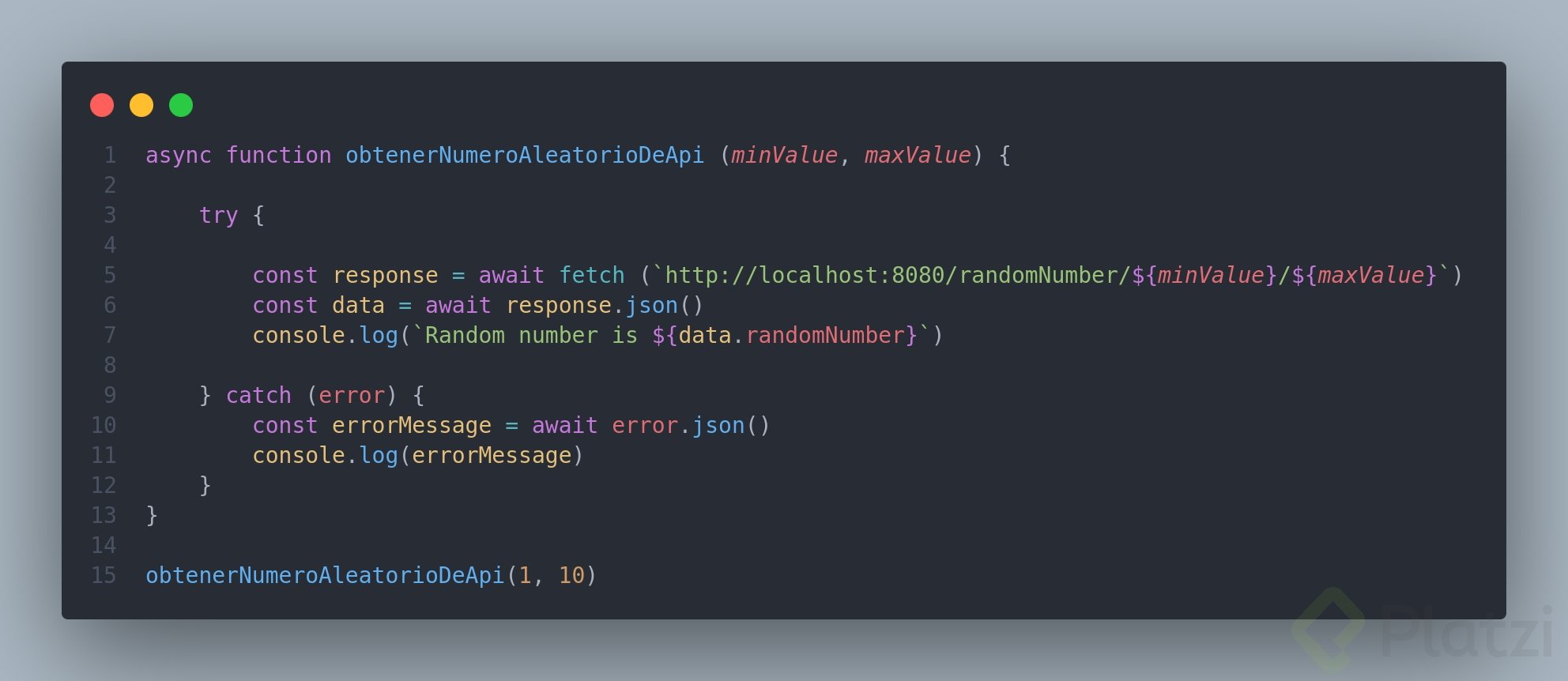 Dentro del ciclo for await, el bloque try se encarga de realizar la fetch y convertir la respuesta a formato JSON. Si alguna de estas operaciones falla, el control pasa al bloque catch, donde podemos manejar el error de manera elegante.