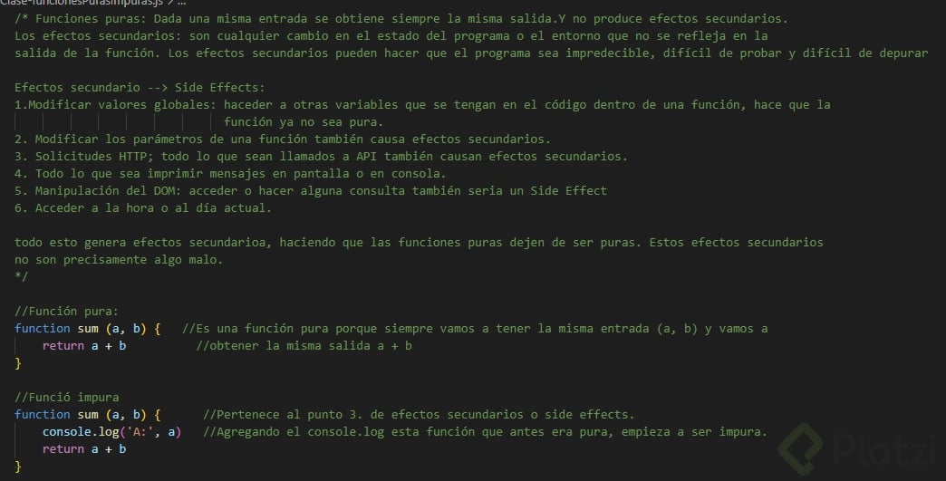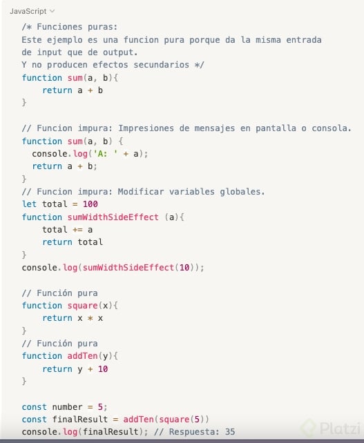 - No produce efectos secundarios ya que no altera ningún estado global ni interactúa con el entorno externo.