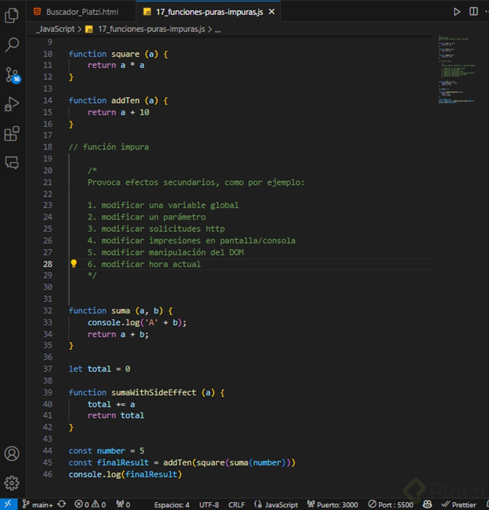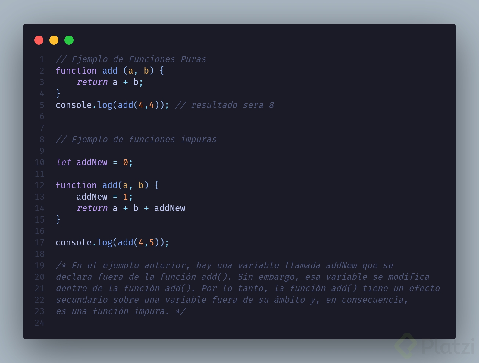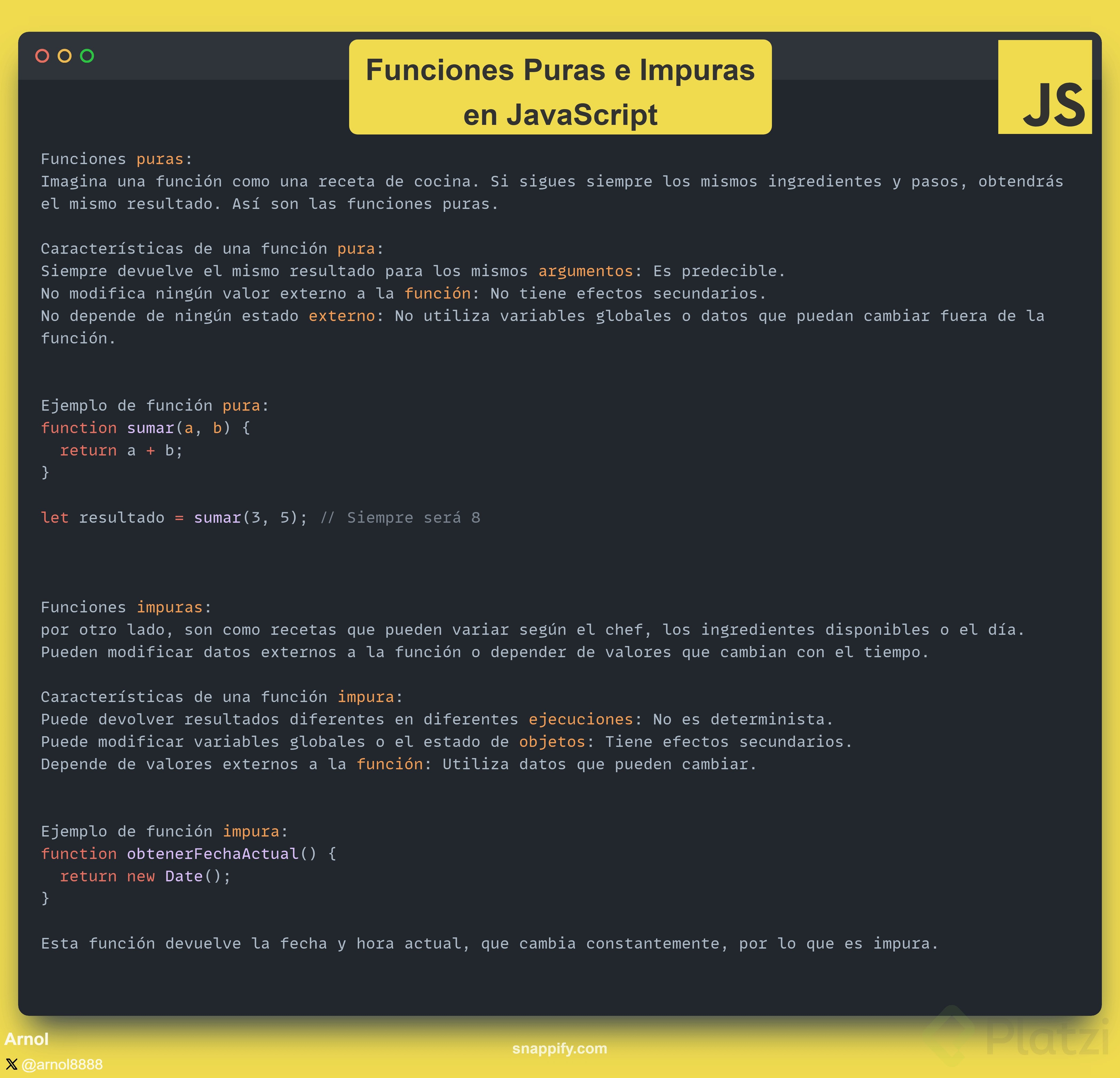 - Modificar variables globales: Acceder y alterar variables fuera del alcance local de una función puede resultar en funciones impuras.